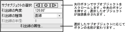 引出線付き注釈の引出線、文字、水平線、および枠を個別に編集できます。引出線を選択すると追加のフィールドが表示されて、線ごとに異なる設定が可能です。左右の矢印ボタンをクリックして、編集するサブオブジェクトを選択します。