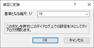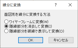 3. 続いて線分に変換ダイアログボックスが表示されます。この設定は、図形に影響を与えません。その図形をワイヤーフレームに変換(W)、隠線部分を消去して変換(I)、隠線部分を破線で表示して変換(D)のいずれかを選択してOKボタンをクリックします。