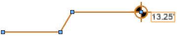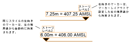 描画図形の右側を向いたマーカーに対して、指定した境界線(左側、右側、またはその両方)から選択したオブジェクトの距離を拘束します。描画図形の左側に向けてマーカーを描画(反転)すると、拘束も自動的に反転します。