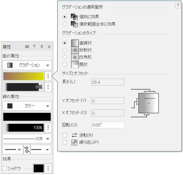 図形上のグラデーションパターンを繰り返します。選択解除すると、単一のグラデーションパターンが図形に適用されます。