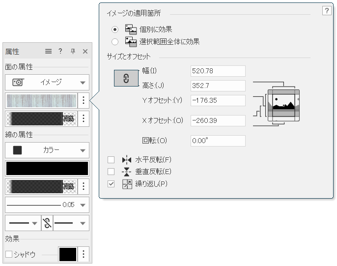 図形上のイメージを繰り返します。選択解除すると、単一のイメージが図形全体に適用されます。