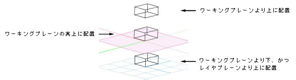 図面内に作成したすべての図形は、ワーキングプレーン上に直接配置しても、その上または下に配置しても、アクティブレイヤのレイヤプレーンに対して配置されます。ワーキングプレーンの位置を変更しても、レイヤプレーンの表示は変わりません。レイヤプレーンはワーキングプレーンの調整中も一定の基準となるフレームを提供します。
