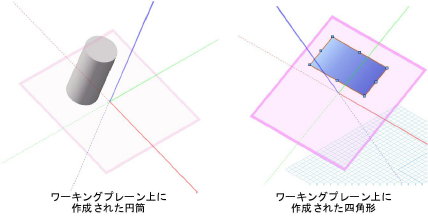 3Dでモデリングを行う場合、「ワーキング」プレーンは形状を配置する3D平面であり、他のどの3Dスナップもアクティブでない時にカーソルがワーキングプレーンにスナップします(カーソルは3D形状にはスナップしません)。ワーキングプレーンは、レイヤプレーン、または必要な他のどの向きにも配置できます。ワーキングプレーンは、レイヤプレーン上にない場合に表示されます。
