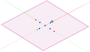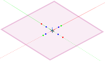 各軸には、他の2軸に対して回転させるための2つのグリップがあります。赤のグリップはX'軸に対する回転、緑のグリップはY'軸に対する回転、青のグリップはZ'軸に対する回転です。グリップの上にカーソルを置くと、回転方向のプレビューが表示されます。ワーキングプレーンの原点にある青のひし形グリップで、ワーキングプレーンの原点を移動できます。