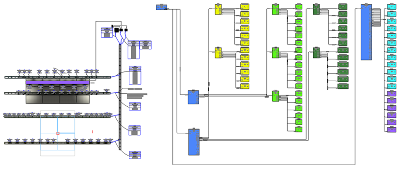 電力概略図は、照明仕込み図上にある、電力計算に関与するすべてのオブジェクトの概略図で構成されます。照明仕込み図と電力概略図には、同じオブジェクトが異なる方法で示されます。照明仕込み図は、物理的な世界を縮小した図面です。一方、概略図は信号の流れを示すように配置されています。この機能は、Spotlightの照明仕込み図の技術と、ConnectCADの概略図作成機能が組み合わせられたものです。