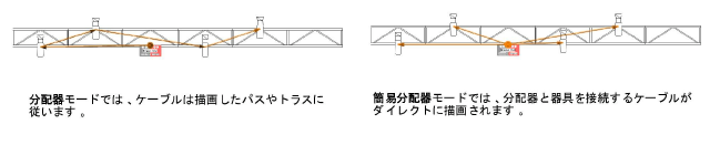 分配器モードでは、ケーブルパスを使用していない場合、何もない場所をクリックしてケーブルのパスを設定して、接続先となる機器までの経路をたどります。セグメントの終点と次のセグメントの開始点を指定します。各点は、既存の形状にスナップされます。ケーブルの配置時には、分配器、電気機器、その他のケーブル、トラスなど互換性のあるオブジェクトが強調表示されます。クリックすると接続されます。ケーブルデフォルト設定の描画時にケーブルを自動でパスに沿わせるオプションを選択している場合は、ケーブルが既存のトラスシステムに沿って接続が作成されます。この方法で線分の描画を続け、ケーブルが完成したらダブルクリックします。