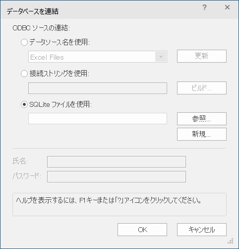 SQLiteファイルを選択するか、先ほどODBCマネージャ/アドミニストレータに追加した名前付きのデータベースを選択します。必要に応じて氏名とパスワードを入力します。