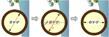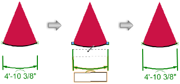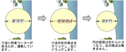 寸法パラメータはすべて、オブジェクト情報パレットおよびプロパティダイアログボックスで利用できます。寸法には、一般的な調整をマウスで直接すばやく実行できる制御機能もいくつかあります。