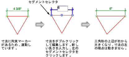 寸法上の任意の場所をダブルクリックして文字編集モードにします。希望する長さを入力し、セグメント位置セレクタを使用して、寸法の大きさを変更しても変化しないセグメントを指定します。 または、文字ツールを選択し、寸法文字をクリックして文字編集モードにします。 連動する寸法の場合は、直線寸法の長さを変更すると、連動する図形の大きさも変化します。