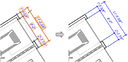 セレクションツールを使用して、変更する寸法を選択します。寸法線の1つを目的の位置までドラッグします。選択したすべての寸法線が同じ距離だけ移動します。寸法補助線のオフセットを示すグレイの破線の1つを目的の位置までドラッグします。選択したすべての寸法補助線の端点が同じ距離だけ移動します。