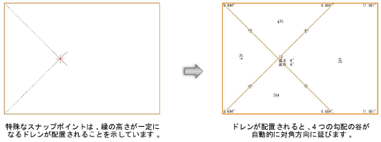 スラブの上にカーソルを移動すると、特殊なスナップポイントが表示されて、縁の高さが一定のドレンを配置しやすくなります。スナップポイントにドレンを配置する必要はありませんが、まだドレンがないスラブ上のスナップポイントにドレンを配置すると、指定されたコーナーから伸びる少なくともいくつかの辺に対して一定の高さのスロープが作成されます。