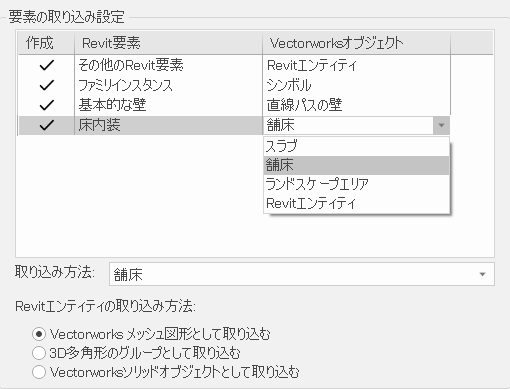 状況に応じて異なるVectorworksオブジェクトタイプとして取り込む必要があるRevit要素に対して、必要なオブジェクトタイプを選択できます。例えば、Revitの床オブジェクトをVectorworksのスラブ、舗床、またはランドスケープエリアオブジェクトとして取り込むことができます。