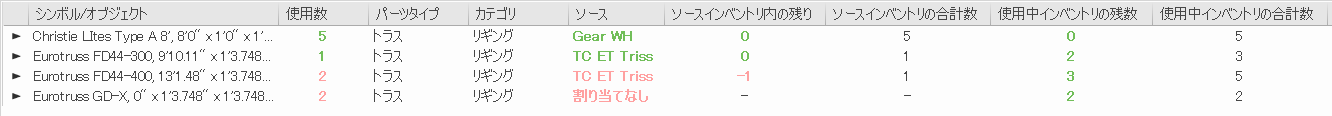 この例では、リギングカテゴリの複数のタイプのトラスが図面に配置されています。1行目では、インベントリで5つのトラスが使用可能で、5つが配置されています。配置できるものは残っていません。2行目では、割り当てられたインベントリで使用可能なトラスは残っていません。ただし、他のインベントリで他のトラスを使用できます。3行目では、割り当てられたインベントリで使用可能な数よりさらに1つ多いトラスが配置されています。最後に、最後の行の項目はまだインベントリに割り当てられていません。