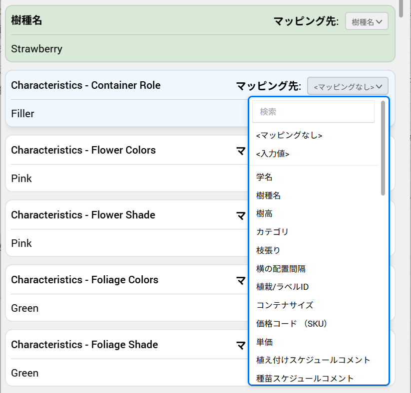 種苗の一部のデータは、Vectorworks植栽スタイルのフィールドに自動的にマッピングされます。マッピングされないデータの場合、またはデフォルトのマッピングを変更するには、マッピング先オプションを使用し、データをマッピングする植栽スタイルのパラメータを指定します。リストには現在マッピングされていないパラメータだけが表示されるため、マッピングの重複を防ぐことができます。検索フィールドを使用すると、使用可能なオプションのリスト項目が絞り込まれます。さらに以下のようなマッピング機能があります: