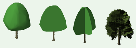植栽の3D表示を選択します。精度のレベルが高いほど、パフォーマンスが遅くなることがあります。 簡易イメージ:植栽の大まかな形状に基づいて3Dモデルを作成します。 平面イメージ:植栽の断面に基づいて、常に正面から見た形状を作成します。 十文字イメージ:植栽の2つの断面をお互いに90度交差させてオブジェクトの大きさを表現します。 詳細イメージ(低、中、高):植栽の3Dメッシュモデルを、さまざまな精度で作成します。 |