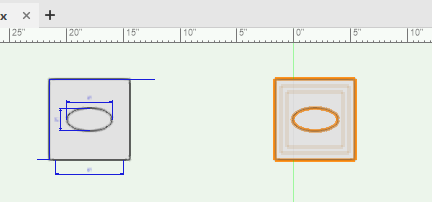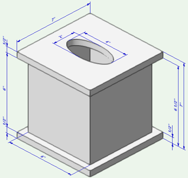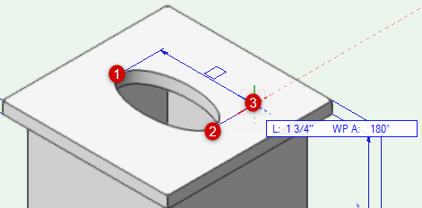 箱の上面にカーソルを重ねて、オートマティックワーキングプレーンをアクティブにします。押し出しの面の中心をクリックし、カーソルをいずれかの辺に向けて移動します。クリックして、長円の短半径を1"に設定します。次に、カーソルを隣接する辺に向けて移動します。クリックして長半径を2"に設定し、長円を作成します。