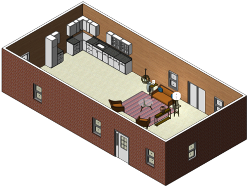 リビングルーム 04シンボルを家の中に配置します。もうすでにオープンコンセプトの素敵な家になってきました!お好みであれば、内壁やドアを配置することもできます。