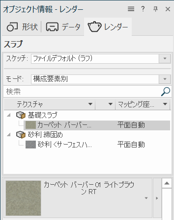 で床スラブをクリックします。オブジェクト情報パレットのレンダータブから、スラブの構成要素である基礎スラブでカーペットのテクスチャを選択します。よく使われるテクスチャは、リソースセレクタのテクスチャ.vwxファイルで見つけることができます。