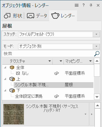 オブジェクト情報パレットのレンダータブから、屋根の上部にシングル 木製 不規則などのテクスチャを追加します。