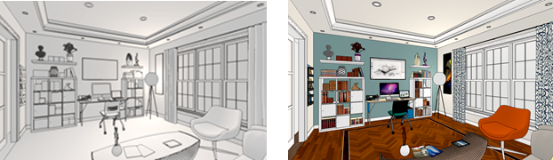 シェイドレンダリングモードは、図面で作業中にデザインの建物や配置を効率的に表示したり、クライアントに概念を提示したりするためのオプションを多数揃えています。