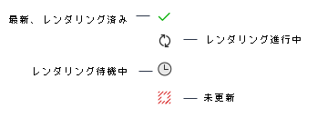 時計アイコン(左)は、レンダリングが待機中であることを示します。アニメーションで面が回転するアイコン(右)は、レンダリングが進行中であることを示します。