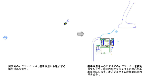 図面に基準原点から遠く離れたオブジェクトが含まれていると、シェイドレンダリングモードの問題が生じたり、丸め誤差に起因する計算精度の問題が生じたりすることがあります。基準原点を中心にオブジェクトを配置すると、基準原点からオブジェクトまでの距離が小さくなるため、この問題が解決します。中心を合わせる操作を行うと、図面上のどのオブジェクトの座標も変わらないようにユーザー原点が調整されます。