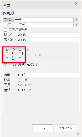 マウスクリックで位置決めを選択している場合は、クリックすると、外枠位置表示で指定した位置から始まる図形が挿入されます(図形座標と外枠表示を参照)。