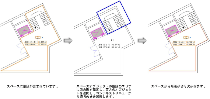 2D面積補正オブジェクトを使用して、スペースの境界線を調整できます。スペースオブジェクトに閉じた2D形状(四角形や曲線など)を配置し、両方のオブジェクトを選択して右クリックし、コンテキストメニューから貼り合わせまたは切り欠きコマンドを選択します。操作後、自動-境界線のスペースと壁の関連付けは維持されます。