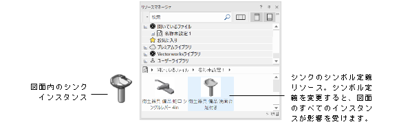 シンボル定義やオブジェクトスタイルはオブジェクトの全体または一部を定義しているため、オブジェクトの形状/パラメータは、その定義/スタイルを使用するすべてのインスタンスで同じになります。Vectorworksには、一般的に使用される何千ものシンボル定義やオブジェクトスタイルが含まれており、さらに特定のニーズに合わせて定義/スタイルを作成することもできます。定義やスタイルは、リソースマネージャを通じてアクセスできるリソースであり、図面にオブジェクトインスタンスを配置する時に使用します。また、他のユーザーや他のファイルと共有することもできます。