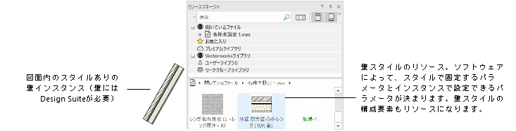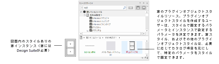 オブジェクトスタイルはパラメトリックです。オブジェクトスタイルによって、一貫したオブジェクトインスタンスを図面に配置するために使われる一連のパラメータが決まります。多くのオブジェクトスタイルでは、すべてのインスタンスで同じにしなければならない一部のパラメータはスタイルで固定し、その他のパラメータは各インスタンスごとに設定することで、必要に応じた柔軟性を持たせることができます。壁スタイルなどの一部のオブジェクトスタイルは、スタイルで固定するパラメータと、インスタンスで編集可能なパラメータが予め決まっています。これに対し、プラグインオブジェクトスタイルを使用すると、スタイルを作成するユーザーがその設定を行うことができます(概念:プラグインオブジェクトスタイルを参照)。