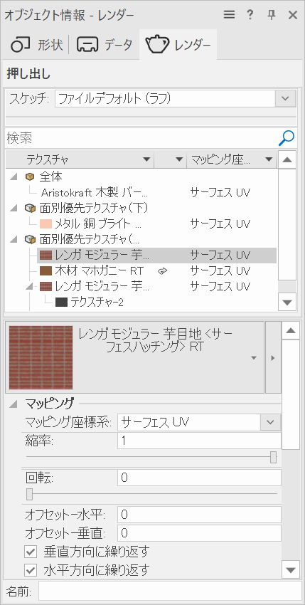 ほとんどの図形において、テクスチャを適用できるエンティティをレンダータブに表示するには、図形および個々の面にテクスチャを適用する必要があります(テクスチャツールを使用してテクスチャを図形や面に適用するを参照)。ただし、テクスチャを適用できる構成要素や各部がある壁、スラブ、屋根、舗床などのオブジェクトでは、これらのエンティティが自動的に表示されます。
