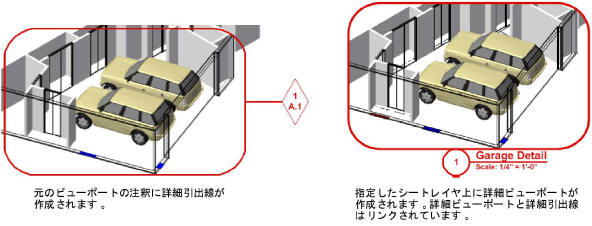 ビューポートとそれに関連付けられている詳細引出線は、レイヤ間で簡単に行き来できるようにリンクされています。詳細引出線を移動または変形すると、それに合わせて詳細ビューポートが更新されます。詳細引出線マーカーは、詳細ビューポートの番号が変わった場合や詳細ビューポートが別のレイヤに移動した場合に自動更新されるように設定することもできます。