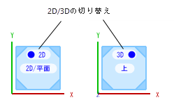 2D/平面ビューに変更するには、キューブの上面が表示されているビューから、上面の2D/3D切り替えをクリックします。上面を表示するには、場合により現在の3Dビューを変更する必要があります。