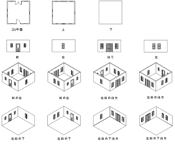 上、前、右、下、後ろ、および左ビューでは、3D基本ビュー/立面図が表示されます。 |