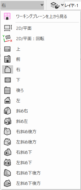 デフォルトで、ビューはレイヤプレーンを基準にしています。ワーキングプレーンを基準にしたビューにしたい場合は、表示バーの基準面設定としてワーキングプレーンビューを選択します。概念:ワーキングプレーンを参照してください。