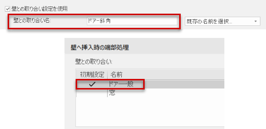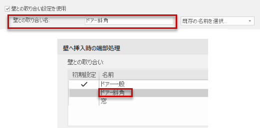 ドア(上)と壁スタイル(下)のどちらにも同じ壁との取り合い名が設定されている場合に、照合が一致すると判断されます。このドア周囲の壁の開口部に、適切な壁との取り合い設定が自動的に適用されます。